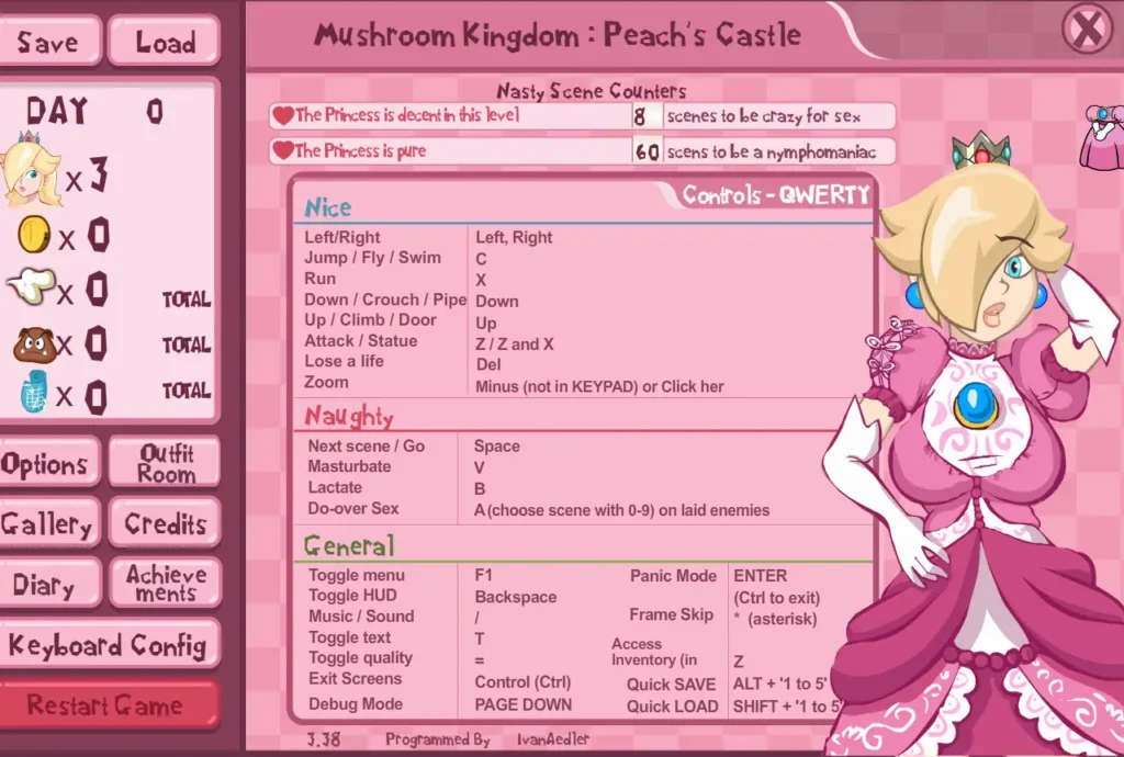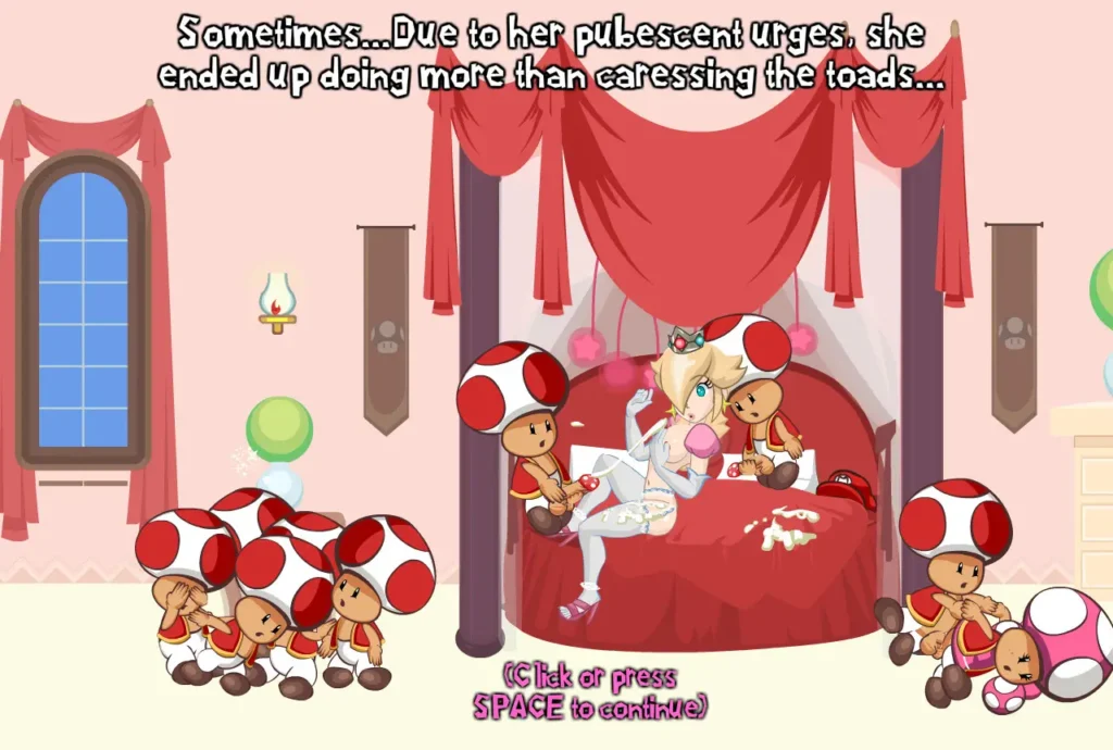 Princess Peach has been a pubescent damsel in her kingdom. Aside of having to rule the Toad’s land, she was discovering herself, as she is now an adult. She is getting more and more aroused, while discovering things like the ability to keep some things hidden ‘there’ (her ‘back hammerspace’)…She had urges we may not know until then…maybe she loves to tease her ass with the Dildo at every morning? Is she getting fed by the Toads? Mario is always saving her without knowing those details.